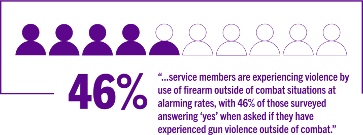 - Veterans surveyed are experiencing gun violence outside of combat situations at alarming rates, with over 46% answering “yes” when asked if they have experienced gun violence outside of combat.